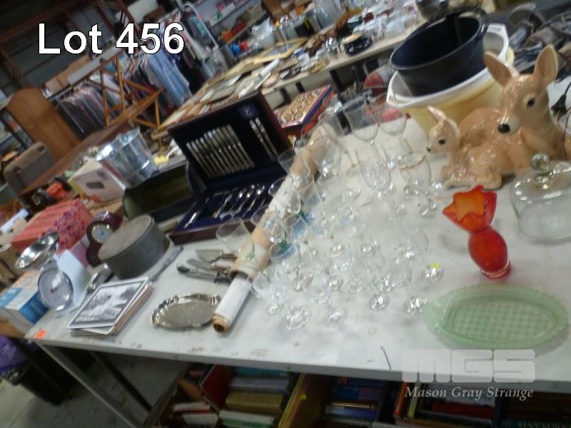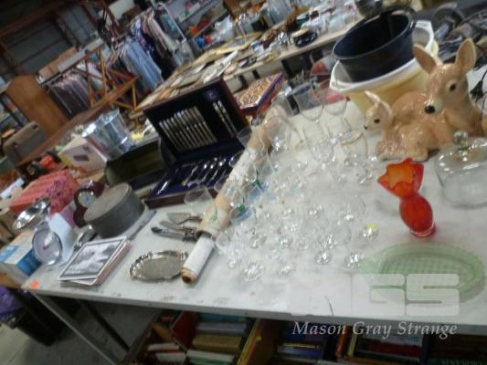 GLASSWARE, CUTLERY, BREAD BOX, SCALES & HOMEWARES, 1 x TABLE