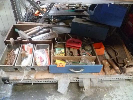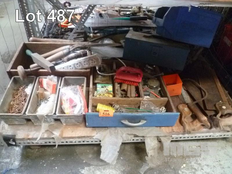 ASSORTED HAND TOOLS, VARIOUS SAWS, NAILS, STORAGE TRAYS, 1 x BAY