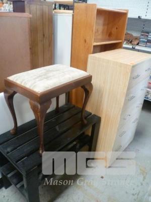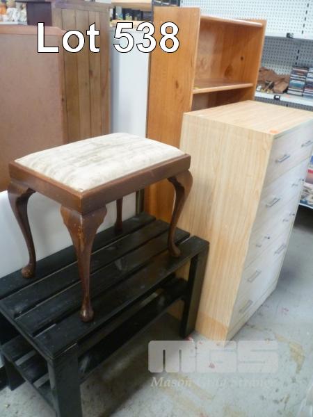 LAMINATE TALL BOY, (HANDLES BROKEN), PINE BOOKCASE, TIMBER SLAT SHELF UNIT & STOOL