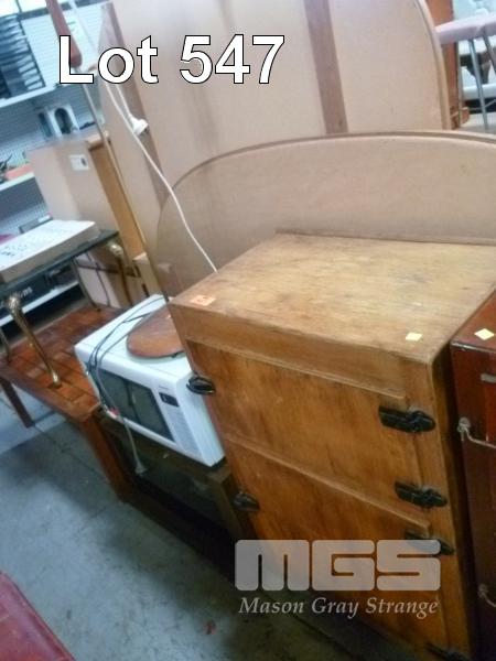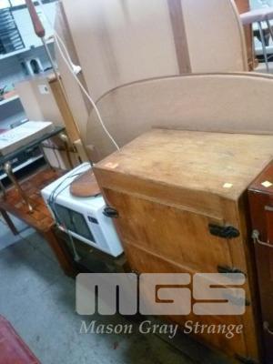 VINTAGE TIMBER ICE BOX, ENTERTAINMENT UNIT, MICROWAVE & STANDARD LAMP