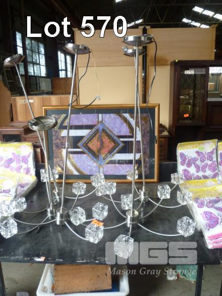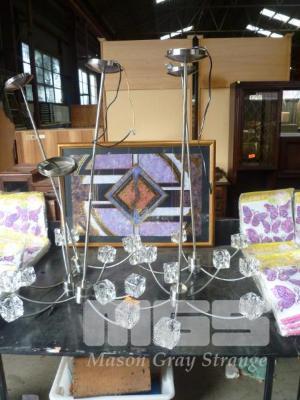 SET 5 STAINLESS STEEL LIGHTS, CEILING LIGHTS INC 2 x 5 & 3 x 3 LIGHTS WITH LARGE FRAMED PRINT
