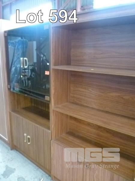 2 x BROWN LAMINATE BUFFET UNITS, 2 x GLASS DOORS, 2 x SHELVES & 4 x DOORS UNDERSTORAGE