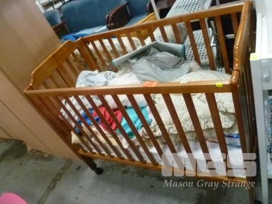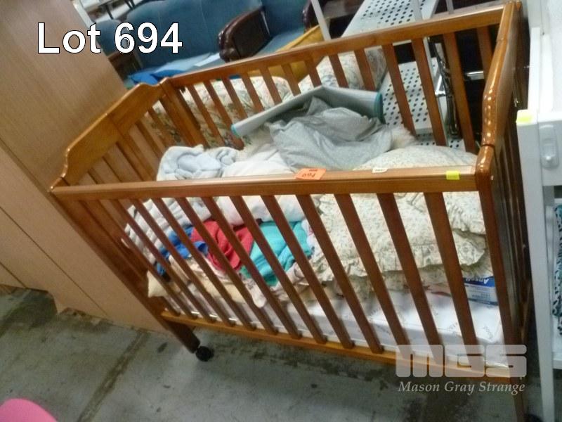 TIMBER COT WITH MATTRESS, BLANKETS, RUGS, ETC