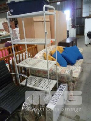 FLORAL FABRIC 2 SEATER LOUNGE, SIDEBOARD, METAL SHELF UNIT, OFFICE CHAIR, PEDESTAL FAN, HEATER & PET CARRIER