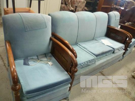 TIMBER FRAMED, CANE SIDED, JACOBEAN 3 PEICE LOUNGE SUITE, BLUE FABRIC UPHOLSTERED, INC; 3 SEATER ( DAMAGE TO ARM) & 2 X SINGLES