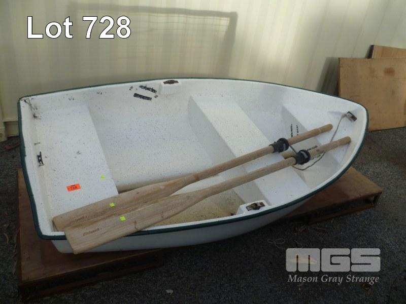 WHITE, FIBREGLASS, DINGHI, LENGTH 2.2 METRES, WITH PAIR OF TIMBER OARS