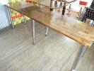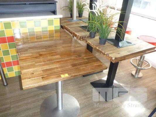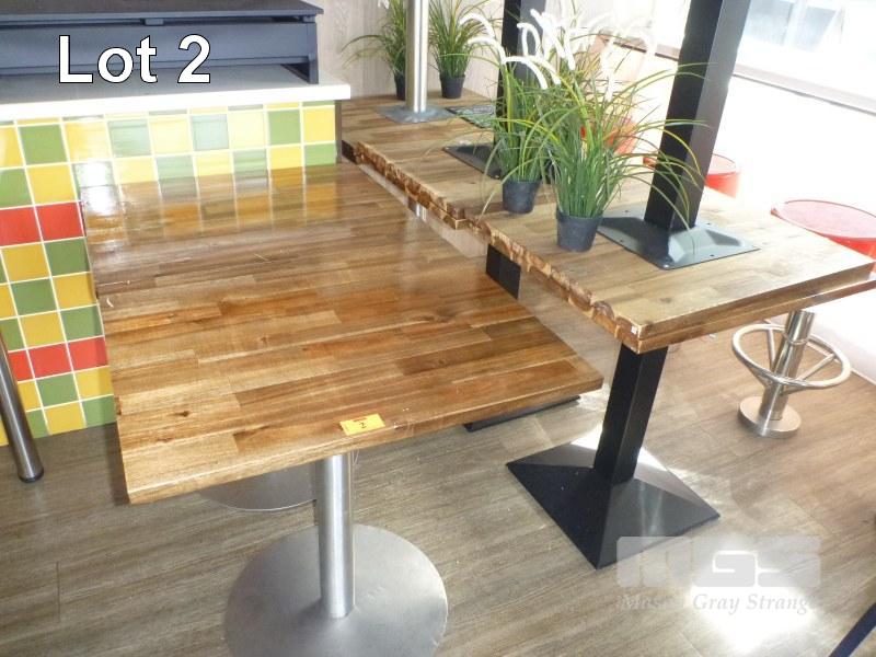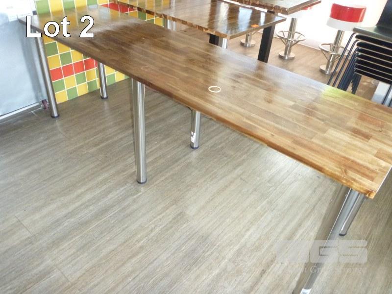 9 x CAFE TABLES, 8 @ 70 x 60cm 1 @ 220 x 60cm, POLISHED TIMBER TOP