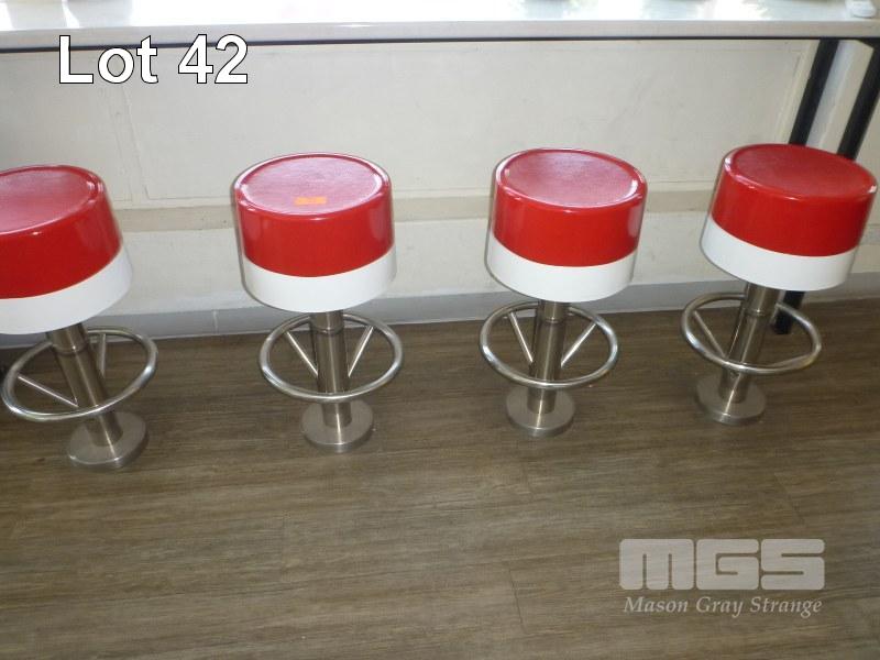 8 x FLOOR MOUNT STOOLS, RED/WHITE PVC, STAINLESS STEEL FRAME, (FIXED, REQUIRE UN-BOLTING)