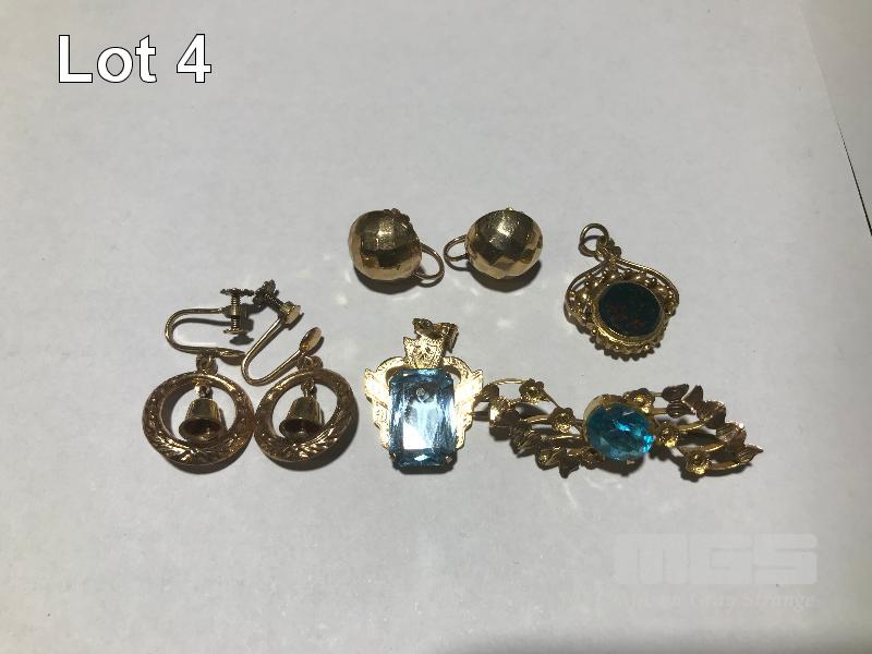 2 X PAIRS OF CLIP ON EARRINGS, 2 X PENDANTS & BROOCH, 1 X PAIR OF BALL LIKE EARRINGS MARKED 9CT