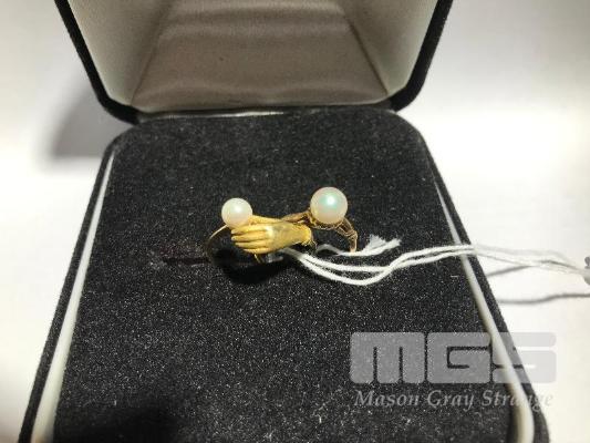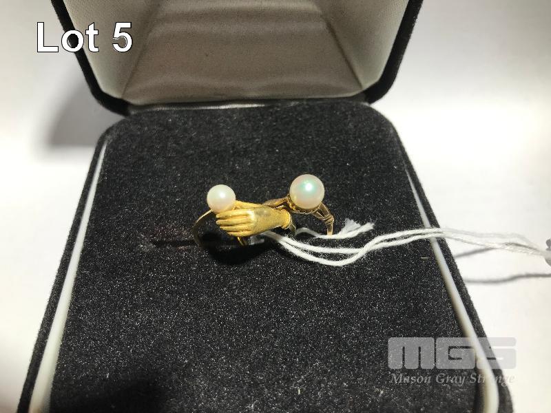 2 X GOLD RINGS MARKED 9CT, WITH PEARL SETTINGS (1 WITH HAND, BAND CUT), SIZE 6.5 & 7 (US) 3.5 GRAMS TOTAL