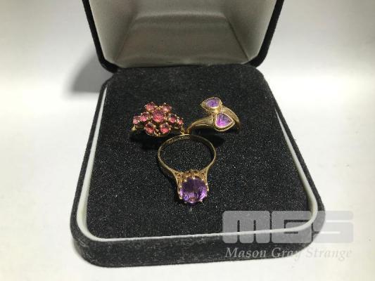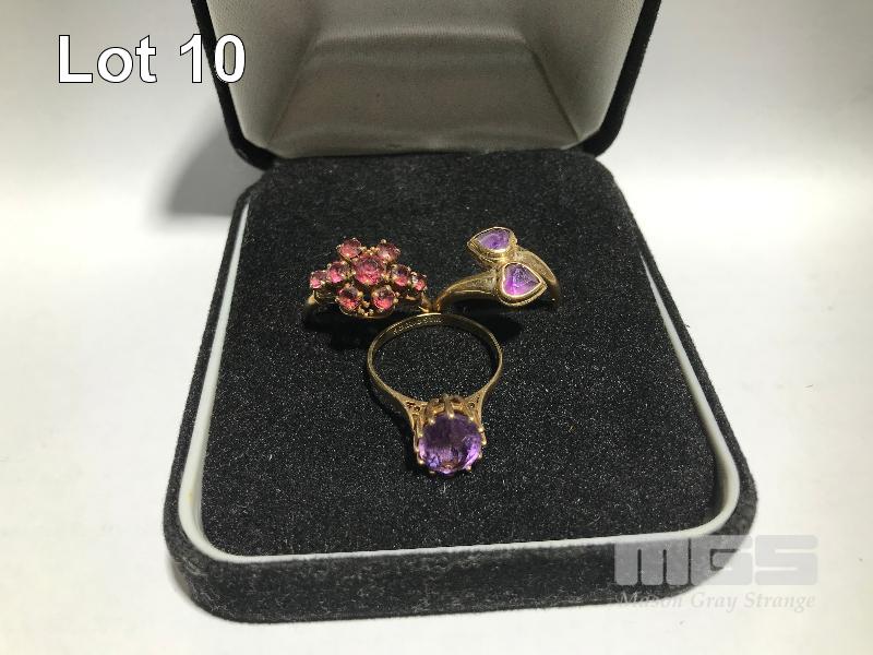 3 X GOLD RINGS MARKED 9CT, 1 X HEART SHAPED WITH 2 X PURPLE STONES, 1 X LARGE PURPLE STONE SETTING, 1 X SETTING WITH 9 X PINK STONES, SIZES 2 X 8 & 8.5 (US) 8.7 GRAMS TOTAL