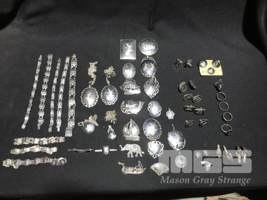 ASSORTED SIAM STERLING ETCHED JEWELLERY, 14 X BROOCHES, 8 X BRACELETS, 4 X NECKLACES, 5 X RINGS, 5 X PAIRS OF EARRINGS, 3 X PENDANTS 3 X PAIRS OF CUFF LINKS, 3 X TIE CLIPS