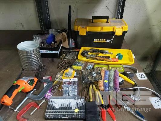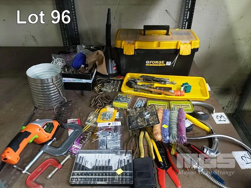 MIXED HARDWARE, HOOKS, CURTAIN HANGERS, TOOLBOX, ASSORTED TOOLS, OZITO CORDLESS HEDGE TRIMMER (HTL-072), G-CLAMPS, STAPLE GUNS ETC