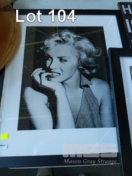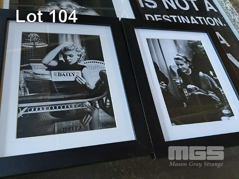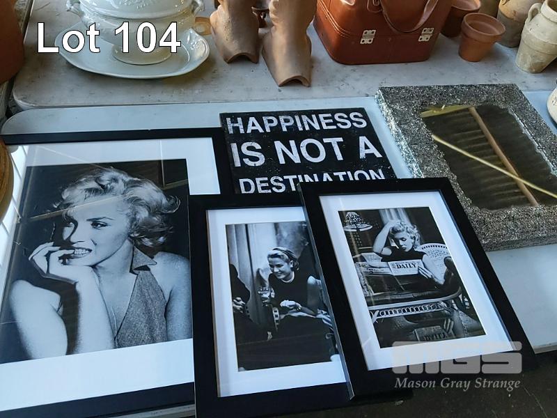 3 x FRAMED BLACK AND WHITE PHOTOGRAPHS MARILYN MUNROE & GRACE KELLY. ORNATE STEEL FRAMED MIRROR AND "HAPPINESS IS NOT A DESTINATION..." WALL ART/PRINT.