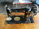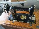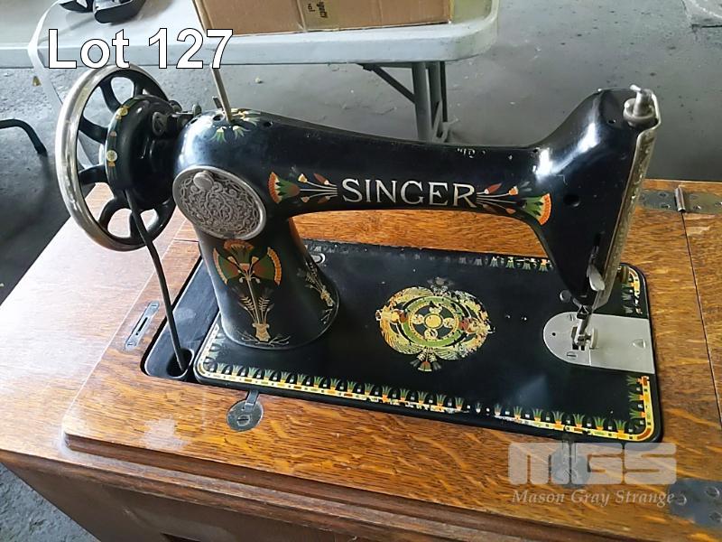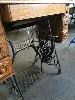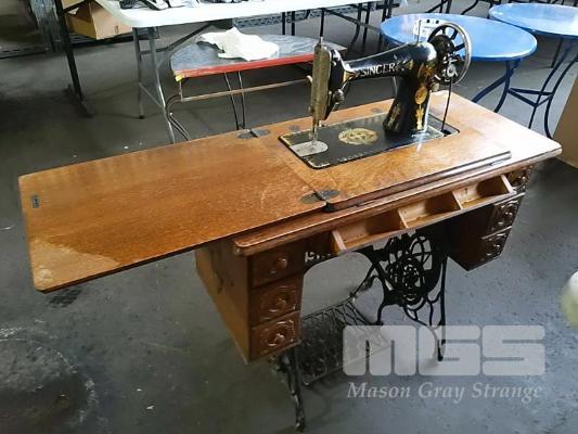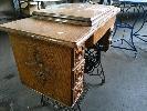 ANTIQUE SINGER SEWING MACHINE, WROUGHT IRON ROTARY TREADLE BASE "SINGER" ON CASTERS, FOLD OUT TABLE, 6-DRAWER WITH SPOOL TRAY.