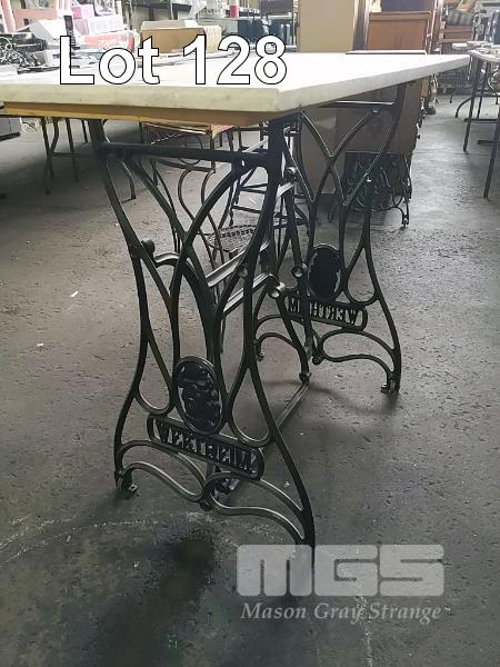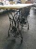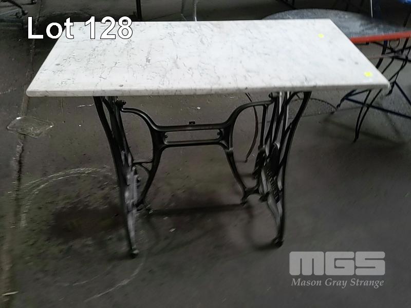 ANTIQUE WROUGHT IRON SEWING MACHINE TABLE "WERTHEIM" IN BLACK ON CASTORS WITH WHITE MARBLE TOP