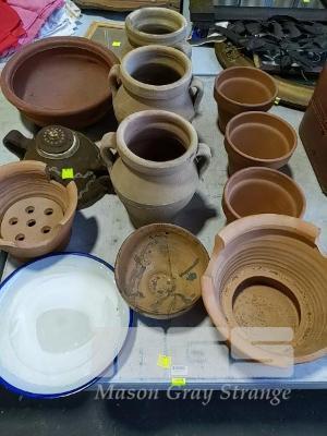 EARTHENWARE POTS, 2-HANDLE JARS, BOWLS, PLANTERS, PLATE ETC