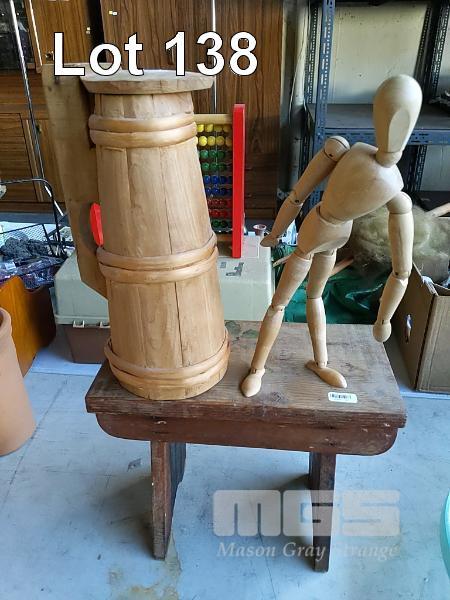 JOINTED ANATOMICAL WOOD DOLL, CURIOUS WOODEN WATER JUG AND VINTAGE RAW TIMBER FOOTSTOOL.