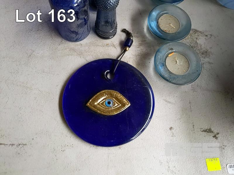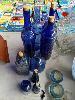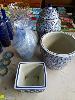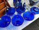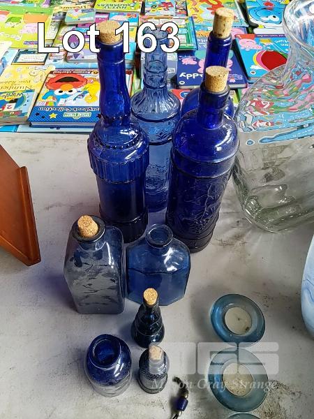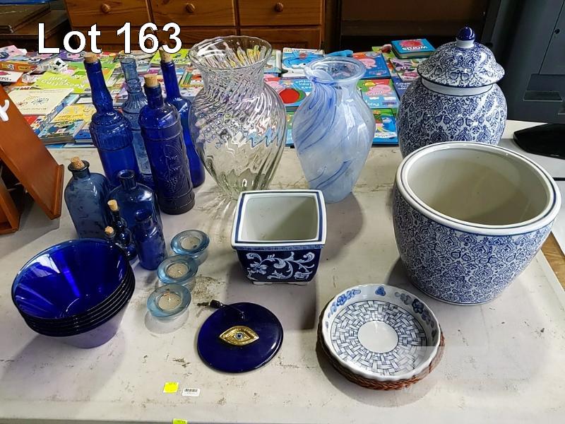 COLLECTION OF BOWLS, GLASS BOTTLES AND ORNAMENTS IN BRISTOL BLUE. WILLOW PATTERN JAR & POTS, GLASS VASES ETC.