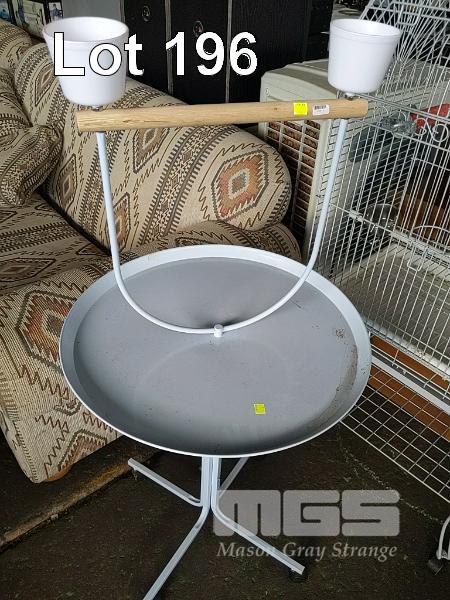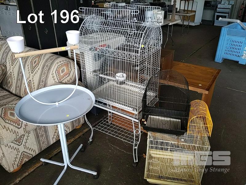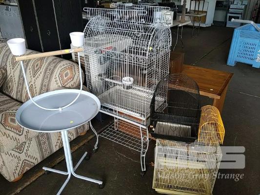 MOBILE PARROT PERCH, SMALL GARDEN PERCH, MOBILE PARROT AVIARY AND 3 x BIRD CAGES