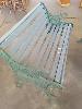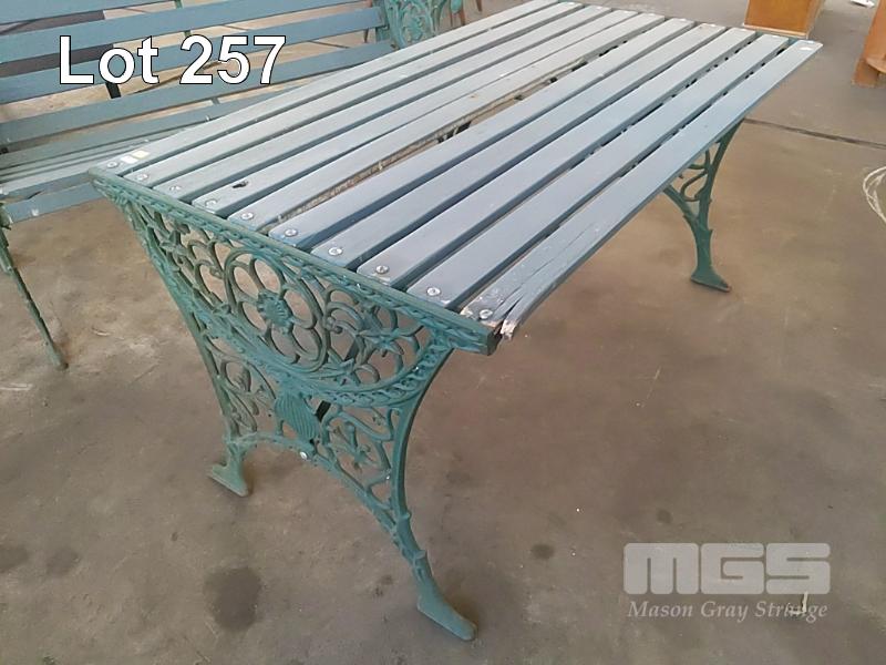 GARDEN BENCH SEAT AND TABLE, WOODEN SLATS WITH CAST ALLOY ENDS.