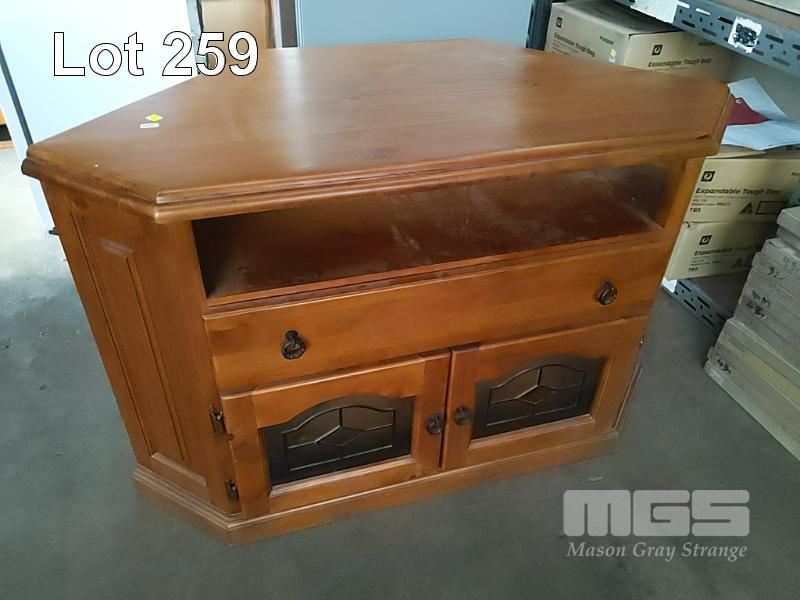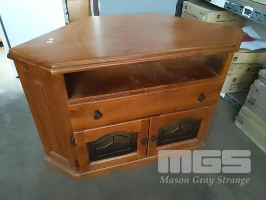 SOLID TIMBER MAHOGANY STAIN CORNER TV CABINET WITH SINGLE DRAWER AND 2 x LEADLIGHT DOORS
