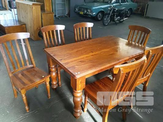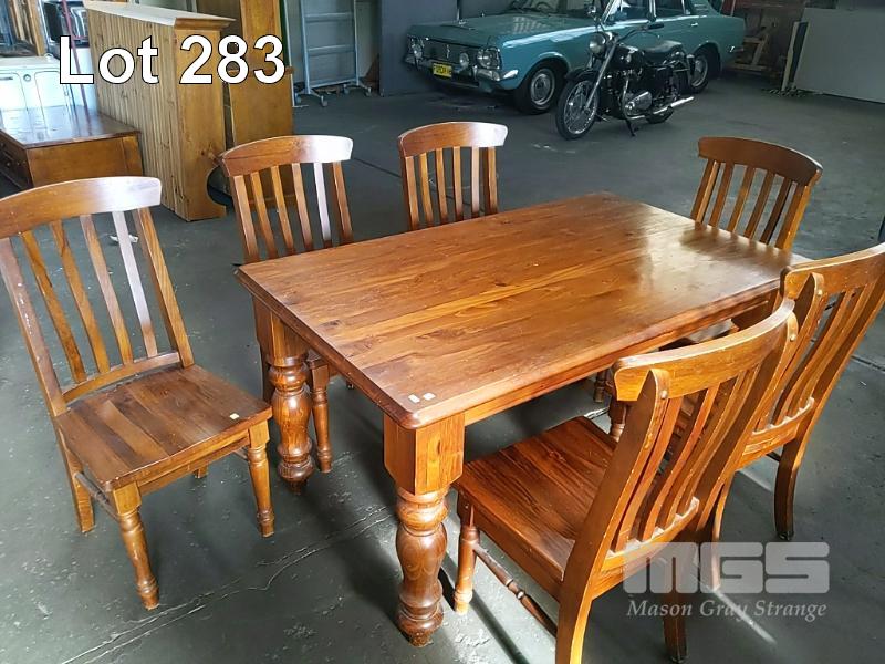 6-SEAT MAHOGANY STAIN TIMBER DINING TABLE AND 6 x MATCHING HIGH BACK TIMBER DINING CHAIRS