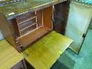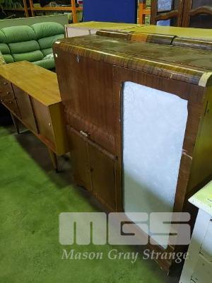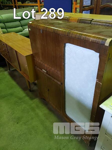 ART DECO TIMBER LAMINATE COCKTAIL CABINET, GLASS DOOR, MIRROR BACKED GLASS SHELVES, FOLD DOWN HUTCH, DRAWER AND 2-DOOR UNDERSTORAGE.