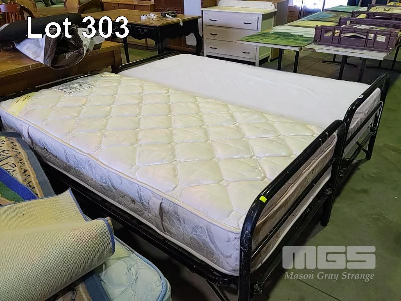 2 x STEEL FRAME SINGLE BEDS WITH FOLD-DOWN ENDS EACH WITH MATTRESS