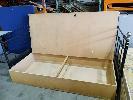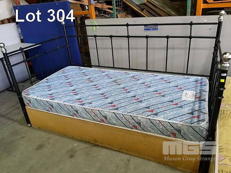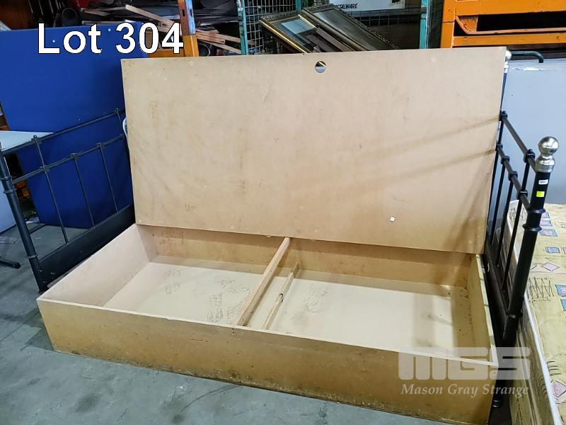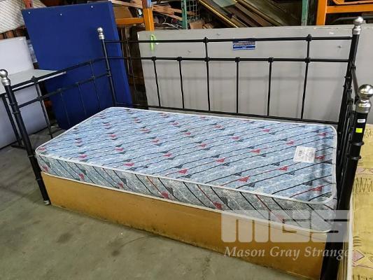 DAY-BED FRAME WITH SINGLE BED MATTRESS ON FIBRE-BOARD STORAGE BOX (LID LOOSE & A FEW SCREWS MISSING)