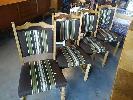 10-SEAT EXTENDABLE SOLID TIMBER DINING TABLE AND 4 x WOODEN FRAMED FABRIC DINING CHAIRS
