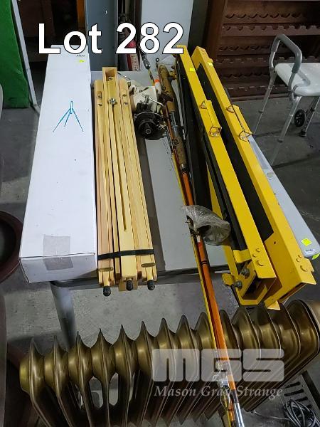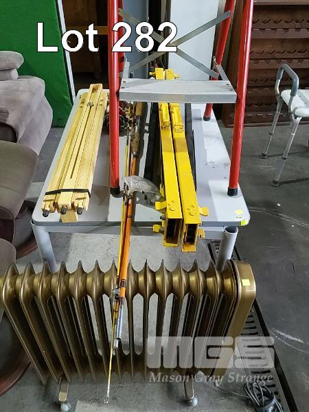 DIMPLEX ELECTRIC OIL HEATER, STEEL TRESTLES, WOODEN PAINTERS EASEL, STEP LADDER AND FISHING RODS