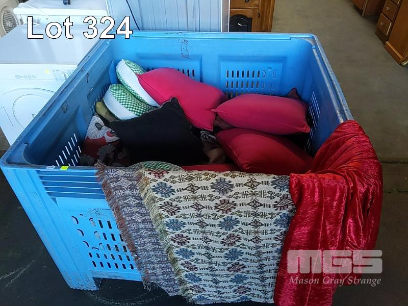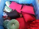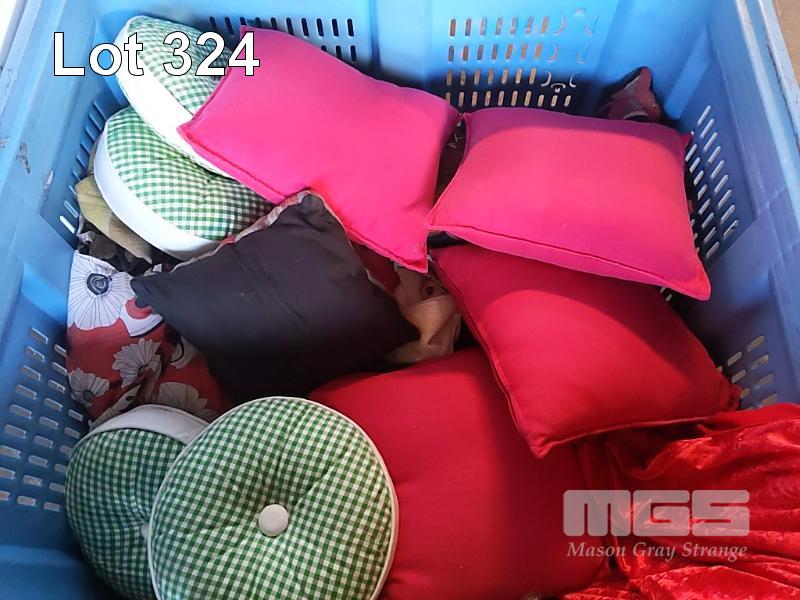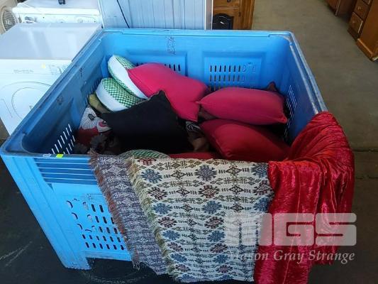 QUANTITY OF HOUSEHOLD LINEN, FABRIC AND CUSHIONS (1 x BIN - NOT INCLUDED)