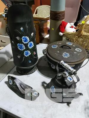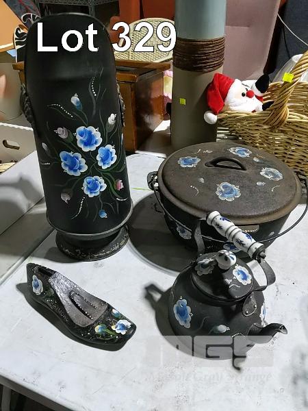 HAND PAINTED CAMP OVEN, WATER JUG, KETTLE AND ANTIQUE SHOE HORN