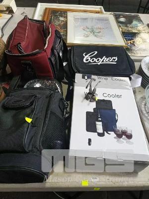 4 x WINE COOLER BAGS/COOLER BAGS (ONE NEW IN BOX) AND CHAMPAGNE CORK EXTRACTOR.