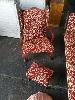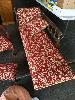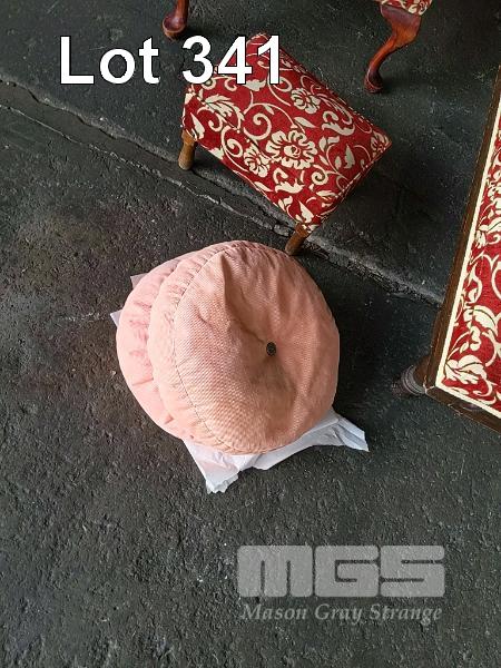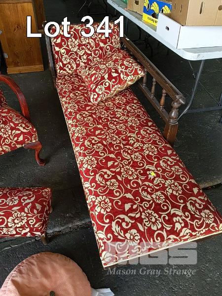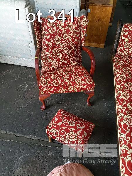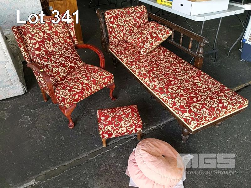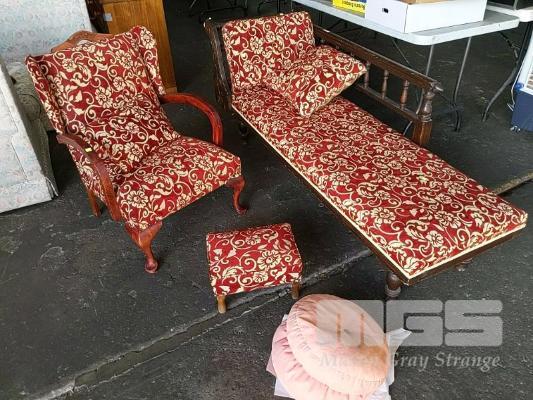 DAYBED WITH WOODEN ARM RAIL & FRAME, ARMCHAIR, FOOTSTOOL AND CUSHIONS IN MATCHING BROCADE PATTERN FABRIC.