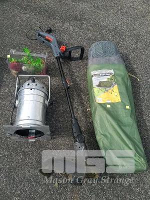 OZTRAIL "COSMOS DOUBLE CHAIR" FOLDING CHAIR. OZITO LINE TRIMMER (LTR-529), CAN STYLE STAGE LIGHT AND AQUARIUM ORNAMENTS