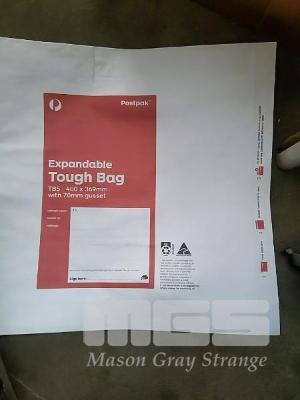 5 x CARTONS POSTPAK EXPANDABLE TOUGH BAG, 100 UNITS EACH (TB5 - 400 x 369mm WITH 70mm GUSSET). 2 OF THE 5 OPENED AND HALF FULL.