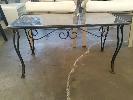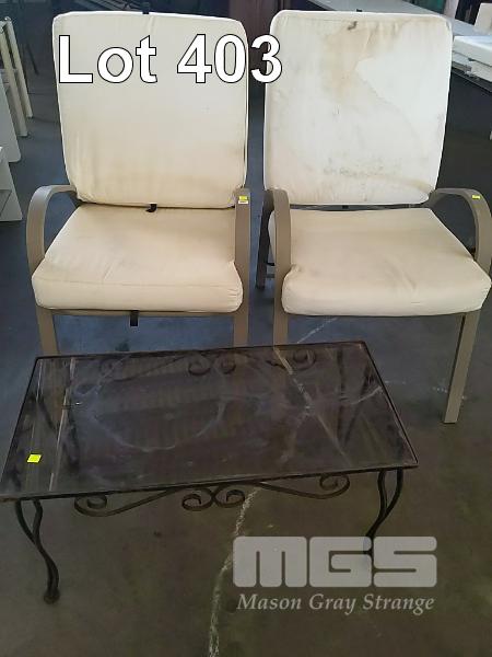 2 x ALUMINIUM OUTDOOR CHAIRS WITH CUSHIONS AND SMOKED GLASS TOPPED STEEL GARDEN TABLE