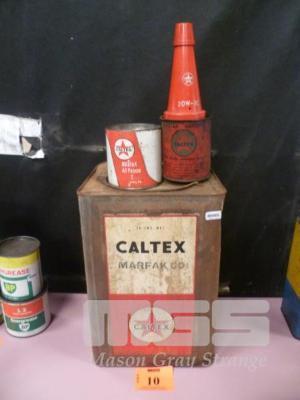 4 x CALTEX ITEMS, INC, 2 x MARFAK GREASE TINS, 1 x 36LB, 1 x 500gm, EARLY CALTEX GREASE TIN, 1LB & 1 x PLASTIC OIL BOTTLE TOP WITH DUST CAP