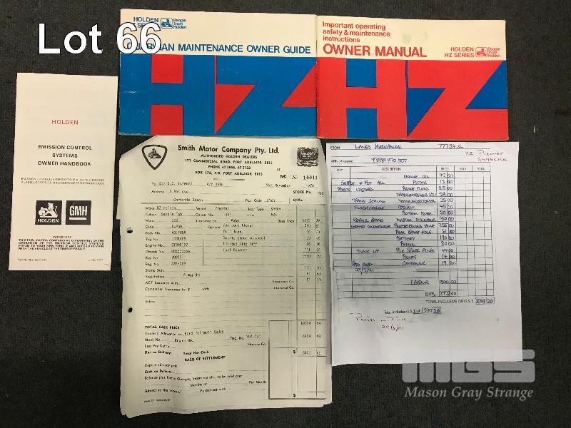 1978 HOLDEN HZ PREMIER SEDAN REG: S496 CKK (SA) (EXPIRED) VIN: NOT RECORDED ENG: QL291401 ODO: 77,760 ORIGINAL KMS 308 8 CYLINDER, 4 SPEED AUTO, PETROL/GAS, SADDLE TAN, 4 DOORS, 5 SEAT, AIR CON, BODY KIT, POWER STEERING, SPARE WHEEL, FACTORY OPTIONS, A/C, SPORTS STEERING WHEEL, LIMITED SLIP DIFF, DUAL EXHAUST, BEIGE VINYL ROOF, SECOND OWNER CAR PURCHASED 1980, ORIGINAL PURCHASE RECEIPT FROM SMITH MOTOR COMPANY, NEAR MINT CONDITION SERVICE & OWNERS MANUALS, LAST SERVICE AT 77,734 COSTING $2,719 (RECEIPT AVALABLE) TAG NUMBERS TAG # L431485 BODY # 431485A ENGINE # QT995127 CHASSIS # BHZ37056A KEY # V0953 (WITH PAPERS, WITH 2 KEY/S, WITH OWNER'S MANUAL, WITH SERVICE BOOKS)