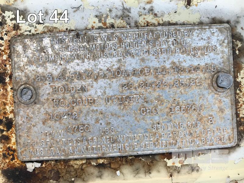 1972 HOLDEN HQ BELMONT UTILITY REG: RUD047 (SA) (EXPIRED) ODO: 13,005 MILES INDICATED NO ENGINE, NO TRANS, PETROL, COVERT BEIGE, 2 DOORS, 2 SEAT, AIR CON, SPARE WHEEL, TOW BAR, GTS GUARDS (1 X DENTED) ORIGINAL OWNERS MANUAL & SEVICE BOOKS (1 OWNER) BODY STYLE - 80180 VIN # L218283 TRIM # 1819-21A BODY S/N-2401 A CHASSIS # CHQ16576A DELIVERY DATE 23/10/72 NO ENGINE OR TRANS RESTORATION REQUIRED (NO PAPERS, NO OWNER'S MANUAL, NO SERVICE BOOKS)