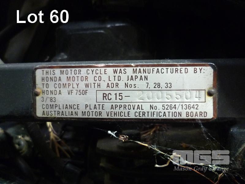 1983 BLACK HONDA VF750F MOTORCYCLE REG: S87-BAL VIN: RC15-2005540 ENG: EC07E-2112832 NO KEY NO PAPERS ODO: UNKNOWN INCOMPLETE: NO BATTERY OR COVER, NO SEAT, NO GAUGES, NO HEADLIGHT OR FAIRING, NO MIRRORS, NO FOOT PEGS, NO ACCELERATOR GRIP