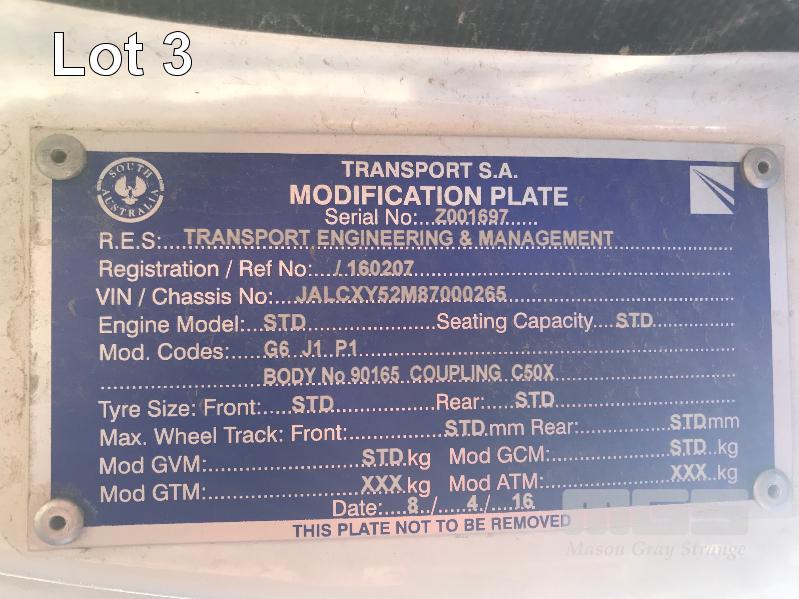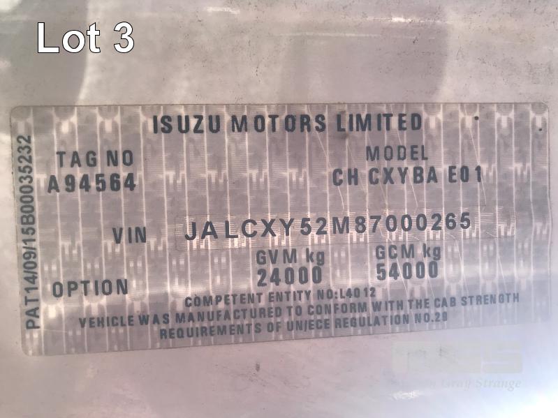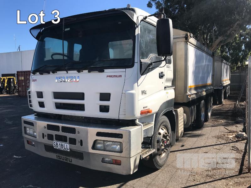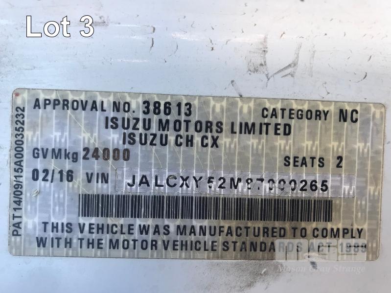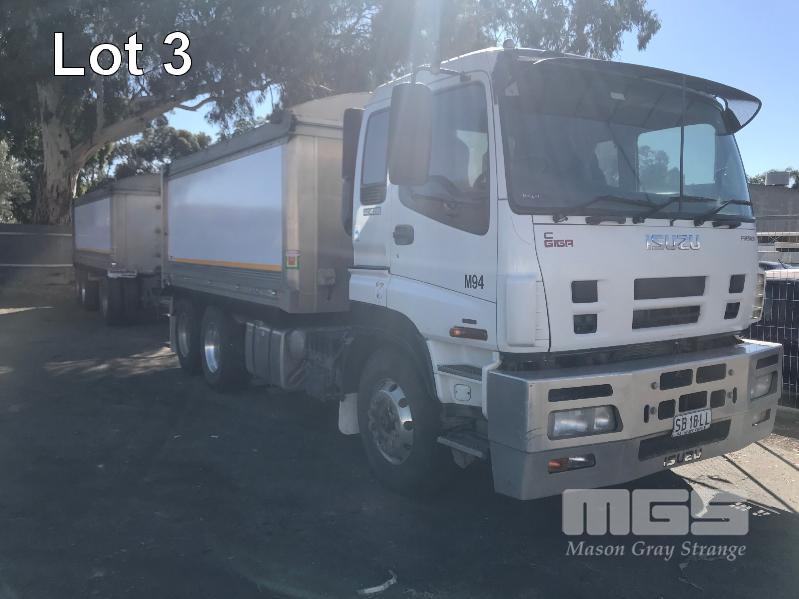 2016 ISUZU GIGA CXY 455 PREMIUM 6 X 4 TIPPER WITH DOG TRAILER REG: SB18LL (SA) VIN: JALCXYS2M87000265 ENG: 6WG1426104 ODO: 387,770 kms SHOWING GVM: 26,000 kg GCM: 54,000 kg LENGTH: 16FT SITEC SERIES II, 6 CYLINDER, 12 SPEED AUTOMATIC MANUAL, DIESEL, AIR BAG SUPSENSION, WHITE, 22.5 TYRES 2 DOORS, 2 SEAT, AIR CON, CD PLAYER, CB RADIO, RING FEEDER, SLEEPER CAB, VISOR, PBS RATED RAZOR TRAP AUTO COVER KEY #33 2016 HAMELEX 20FT DOG TIPPING TRAILER REG: SY27FW VIN: 6F80000000B090166 ATM: 26,000 kg AIR BAG SUPSENSION, TYRES 22.5, RING COUPLING RAZOR TRAP AUTO COVER (WITH PAPERS, WITH 1 KEY/S, NO OWNER'S MANUAL, NO SERVICE BOOKS)