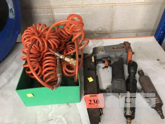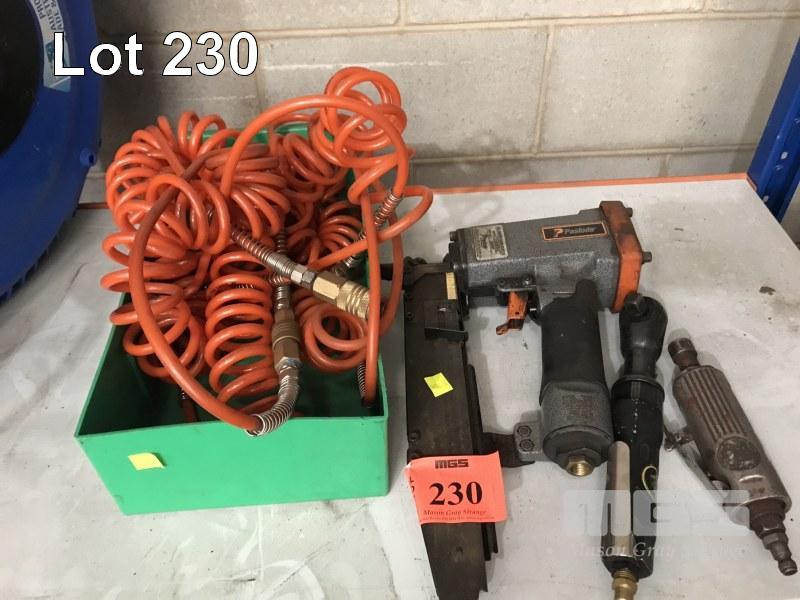 3 x ASSORTED PNEUMATIC TOOLS, PASLODE NARROW CROWN STAPLER, DIE GRINDER & 1/2" RATCHET WRENCH WITH AIR LINES