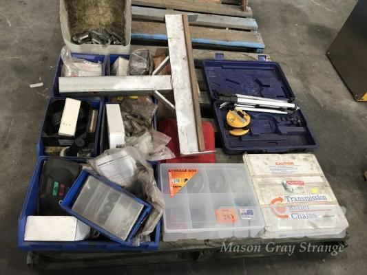 ASSORTED ROLLER CHAIN, LEVEL, BRACKETS, CONTROL BOX & PARTS, 1 x PALLET