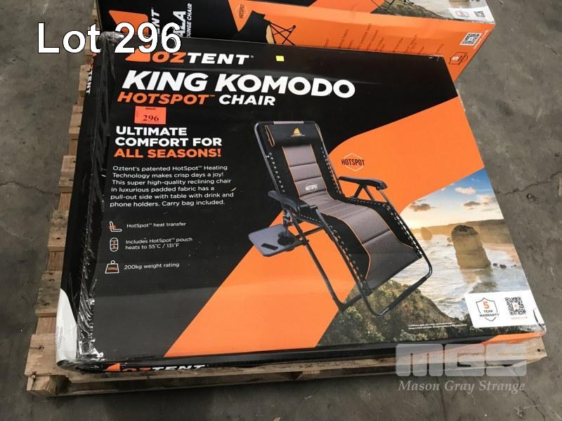 RECLINING CAMP CHAIR, OZ TENT, KING KOMODO, WITH HOT SPOT TECHNOLOGY (WATER DAMAGED)