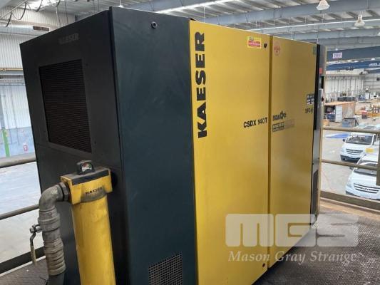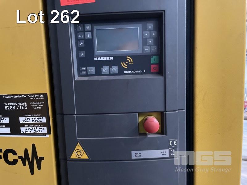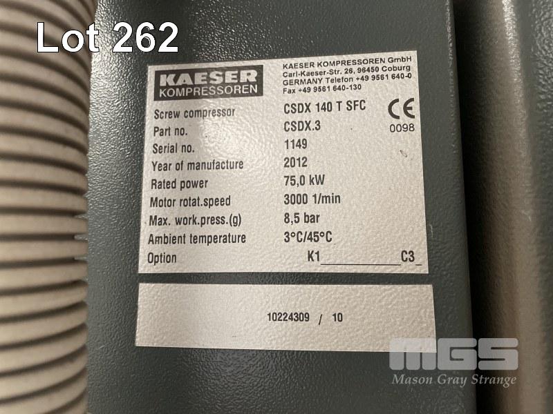 PACKAGED SCREW AIR COMPRESSOR, KAESER SIGMA MOD: CSDX140TSFC DOM: 2012 RATED POWER: 75kw MAX WORK PRESSURE: 8.5BAR REFRIGERATED RUN HOURS: 26,464 SHOWING LOAD HOURS: 16,250 SHOWING LAST SERVICE: 15/1/21