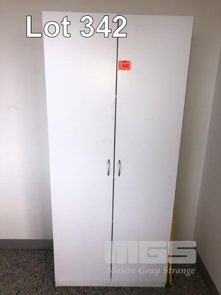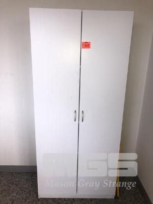STORAGE CABINET, 2 DOOR,WHITE LAMINATE, 800 x 1800mm (H) & CONTENTS ASSORTED UTENSILS & KITCHENWARE