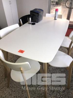 WHITE TIMBER LAMINATE KITCHEN TABLE, 1570 x 900mm & 6 x CHAIRS